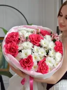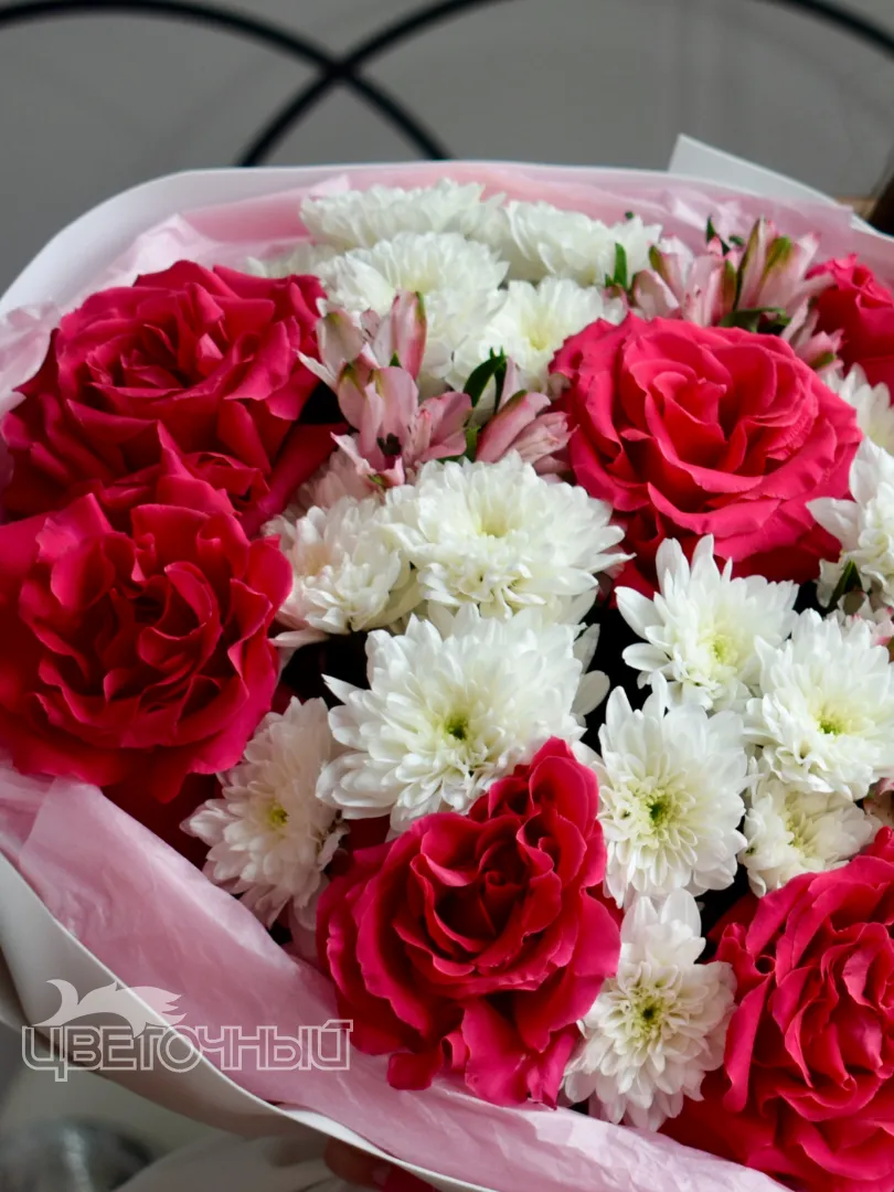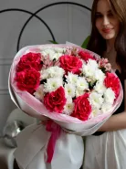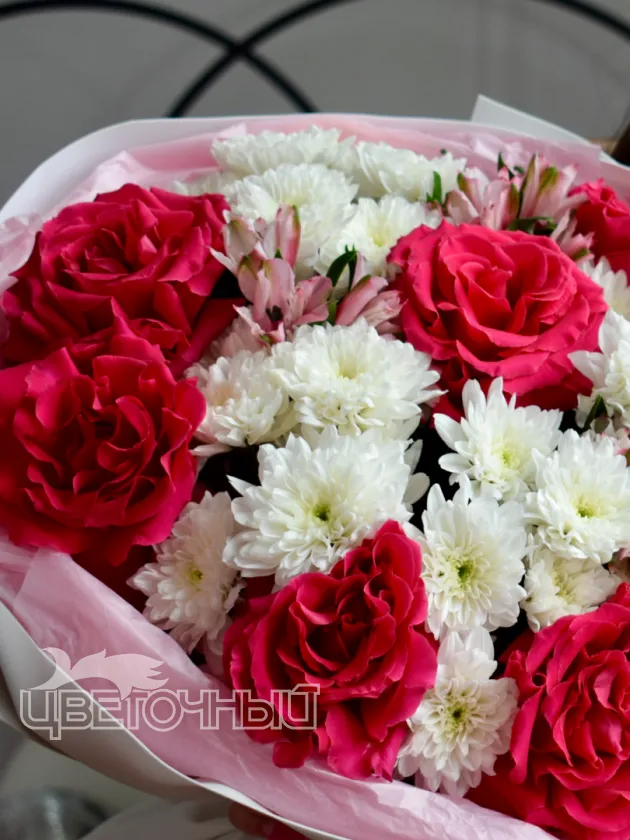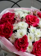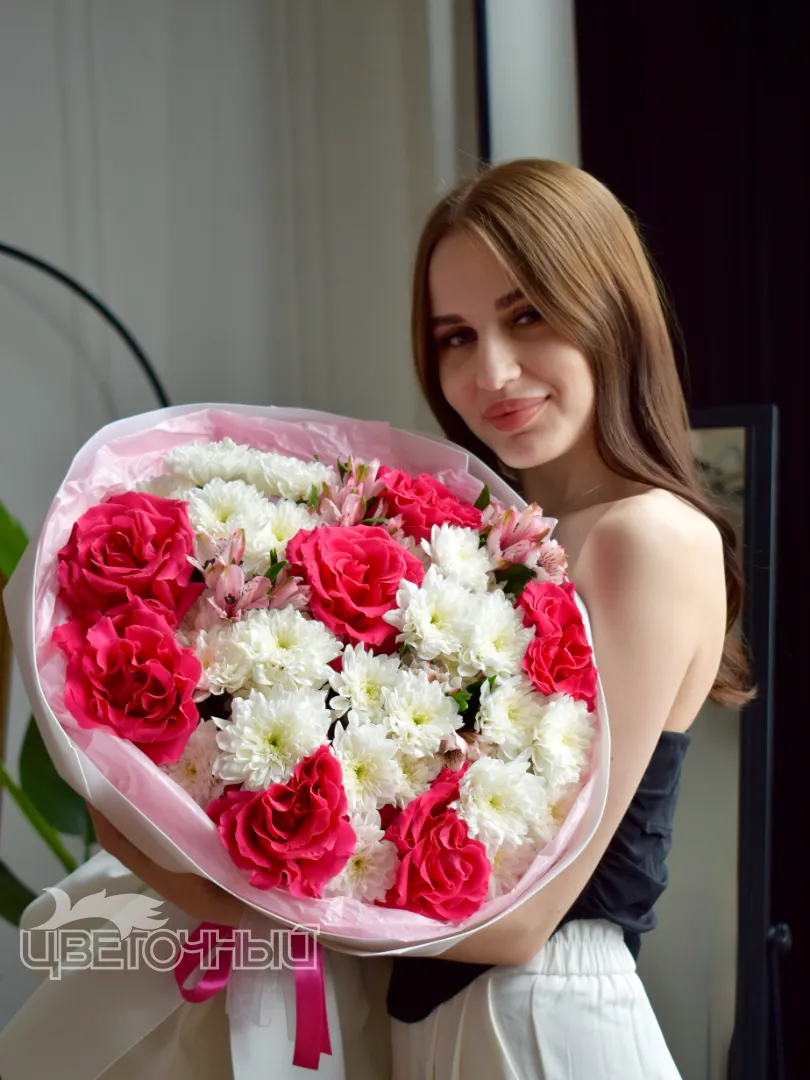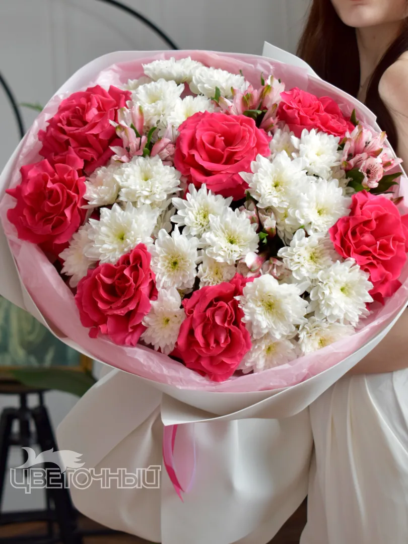 Этот прекрасный букет, включающий крупные розовые розы и воздушные белые хризантемы, станет идеальным выбором для любого торжества. Нежные оттенки цветов в сочетании с элегантной упаковкой создают ощущение праздника и радости, наполняя пространство теплом и светом.