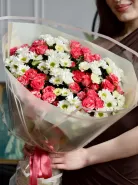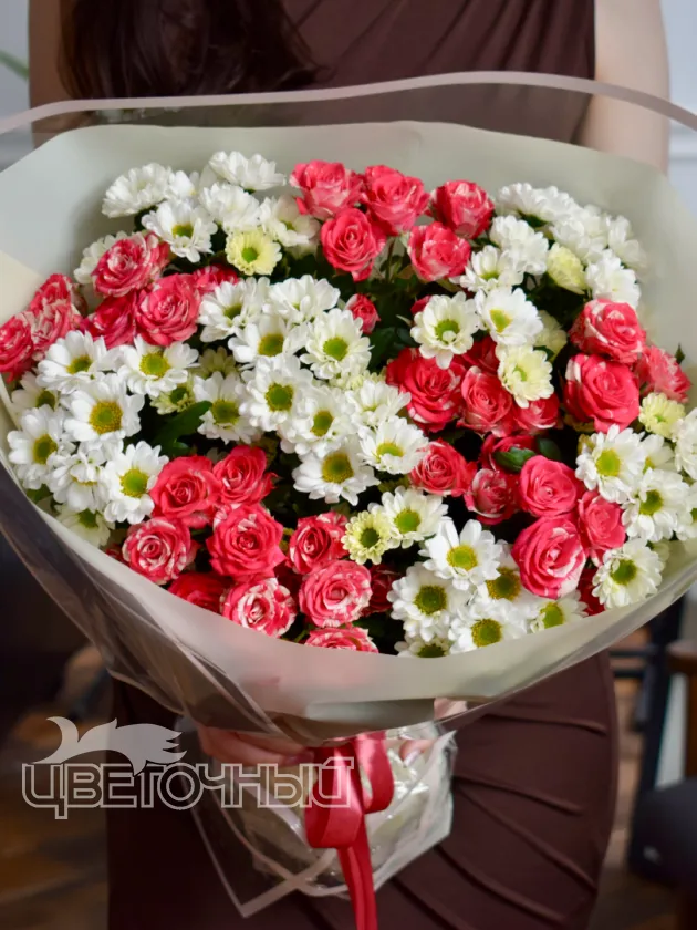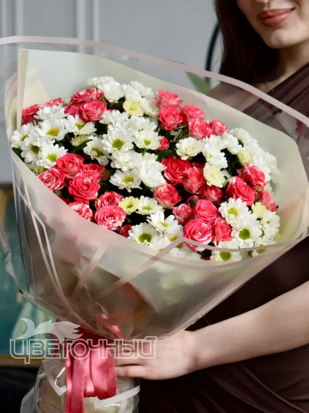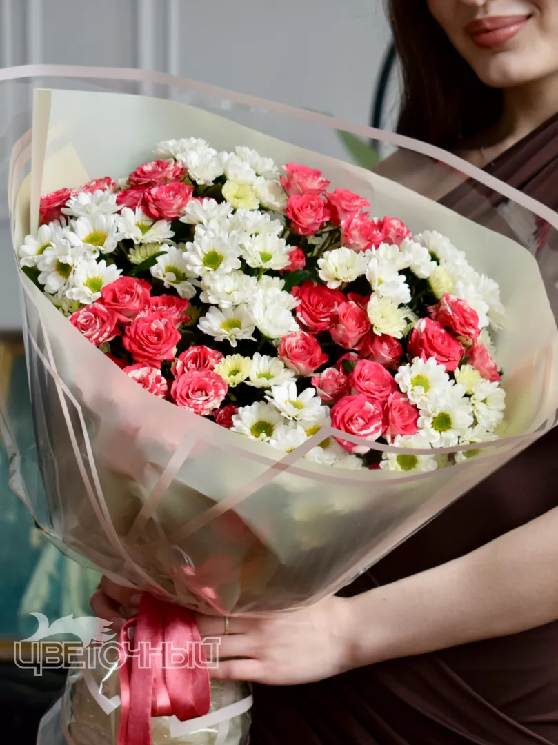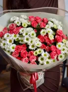 Букет из розовых роз и белых ромашек, объединенных в нежном сочетании, создает трогательный и романтичный образ. Этот букет станет идеальным подарком для близкого человека, выражая вашу заботу и внимание. Простота и элегантность букета делают его универсальным выбором для любого повода.