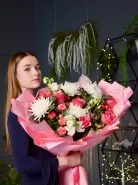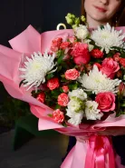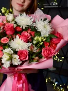 Букет из роз и хризантем в нежных оттенках белого и розового, элегантно упакованный в розовую бумагу с атласной лентой. Невероятно красивый и выразительный букет, способный выразить самые разные эмоции и чувства. Идеальный выбор для романтических моментов и особенных случаев.