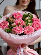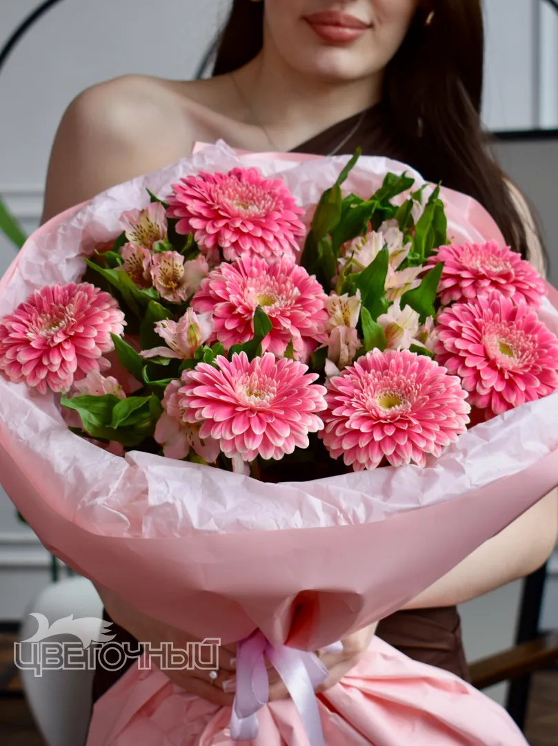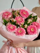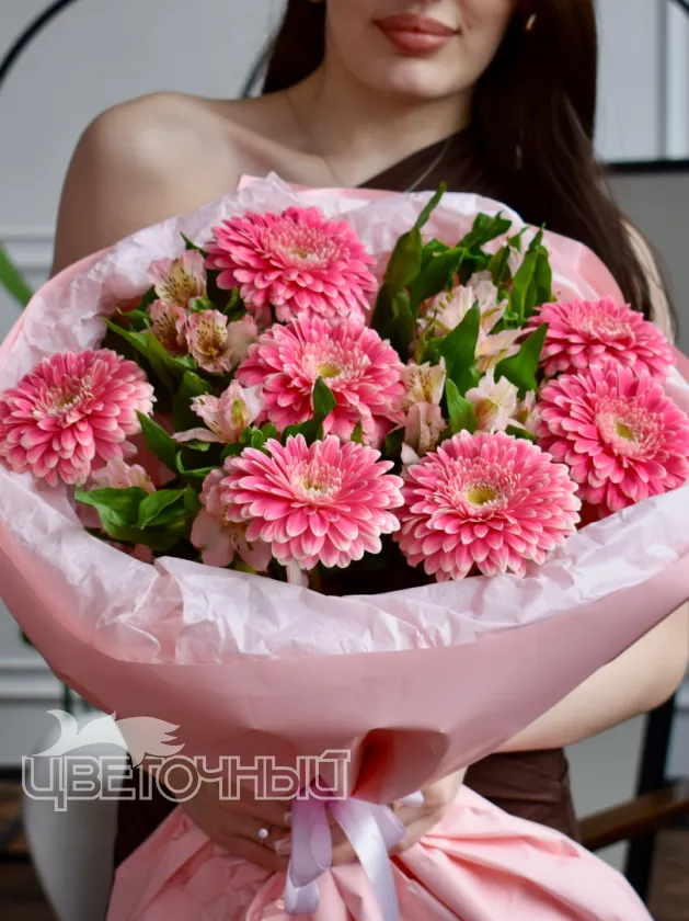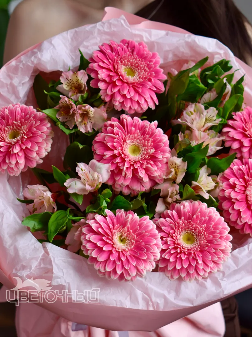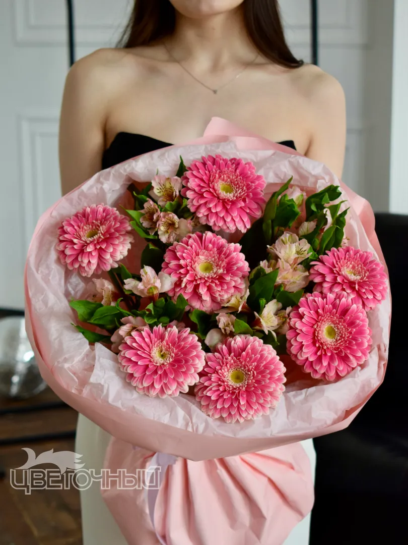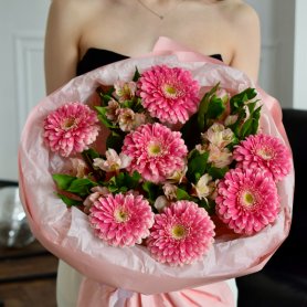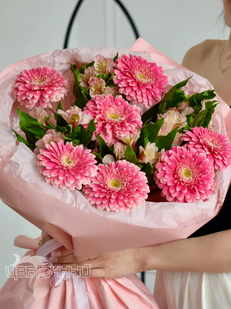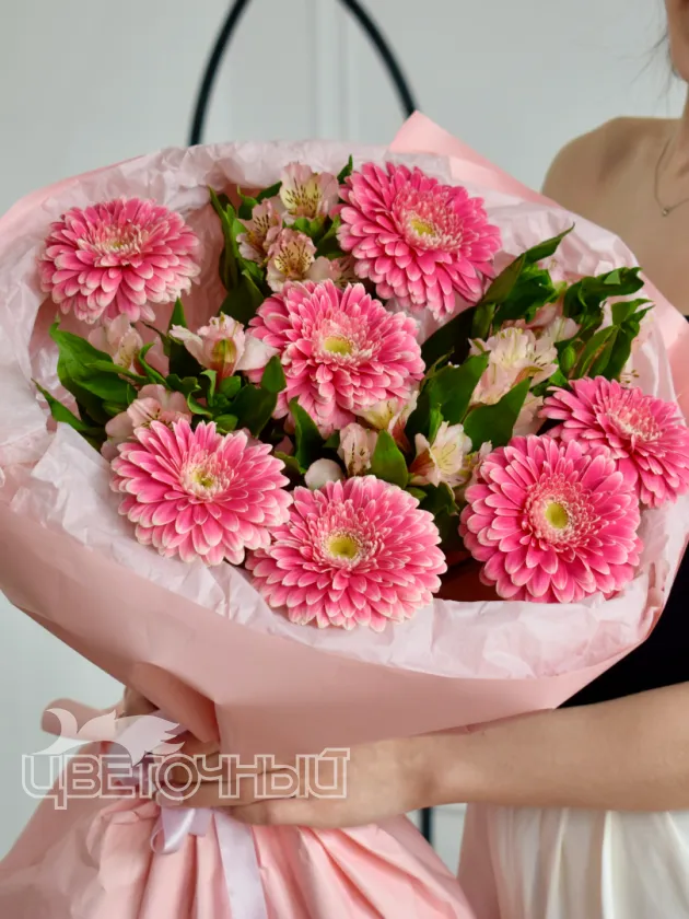 Букет из нежных розовых гербер и альстромерий, элегантно оформленный в светло-розовую упаковку. Нежные оттенки цветов создают атмосферу уюта и ласки, делая букет идеальным для выражения симпатии и любви. Этот букет обязательно порадует и удивит вашу любимую.