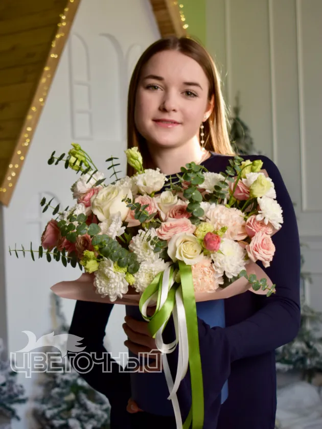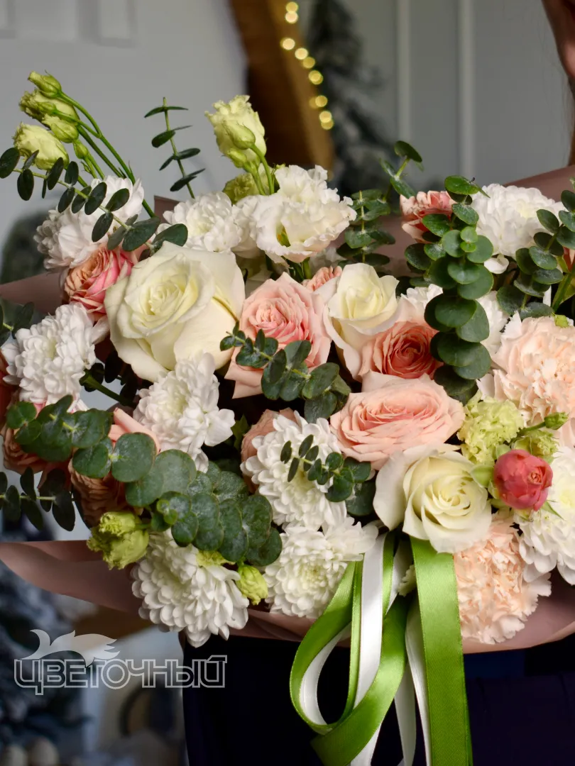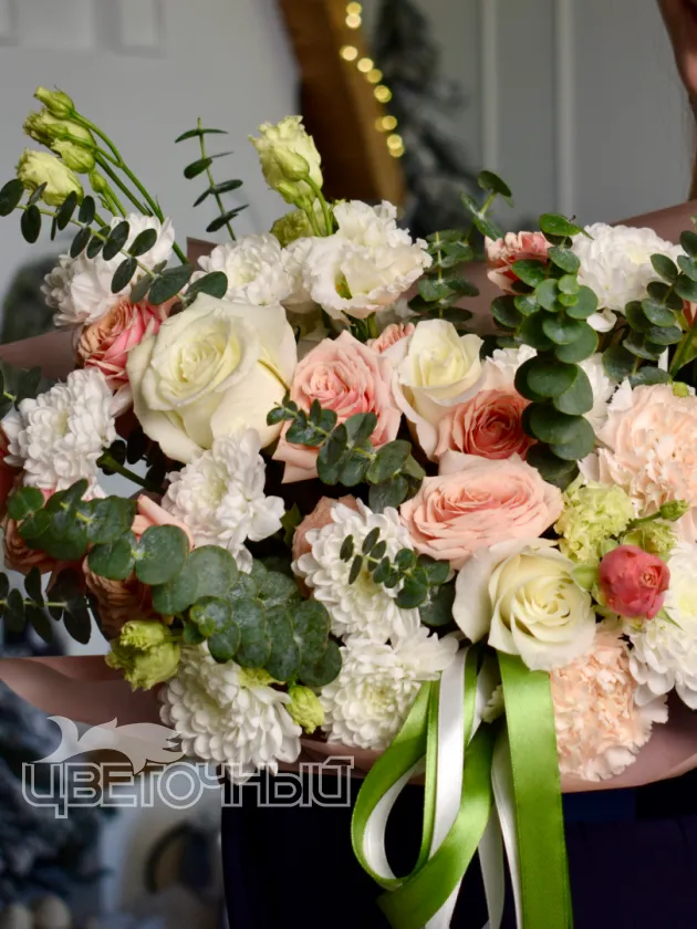 Букет, представленный на фотографии, - прекрасное сочетание нежных оттенков розового и белого цветов, украшенное зеленью эвкалипта. Нежные розовые и белые розы, маттиолы и гвоздики создают воздушную и романтичную композицию. Букет идеально подходит для выражения нежных чувств и станет прекрасным подарком.