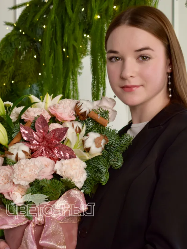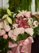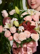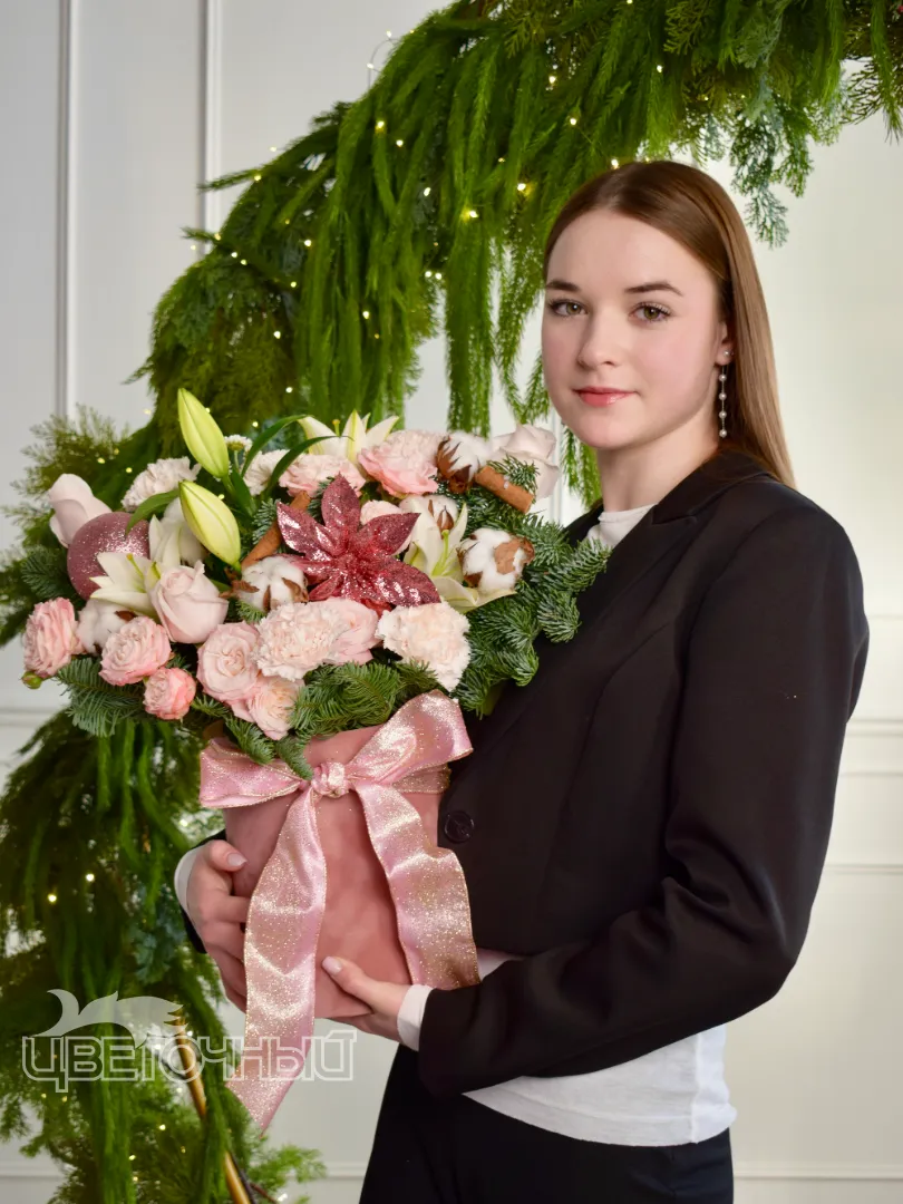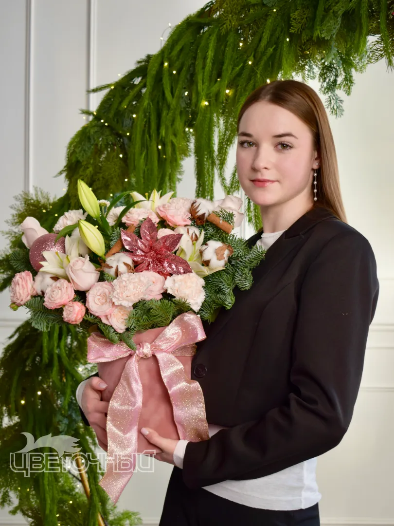 Волшебный зимний букет Зимний букет, в котором нежные цветы дополнены яркими искрящимися акцентами и ароматными веточками хвойных деревьев, станет прекрасным дополнением праздничной атмосферы. Необычная подарочная упаковка с атласной лентой добавит ему изящества и элегантности. Букет станет прекрасным подарком на Новый год или Рождество.