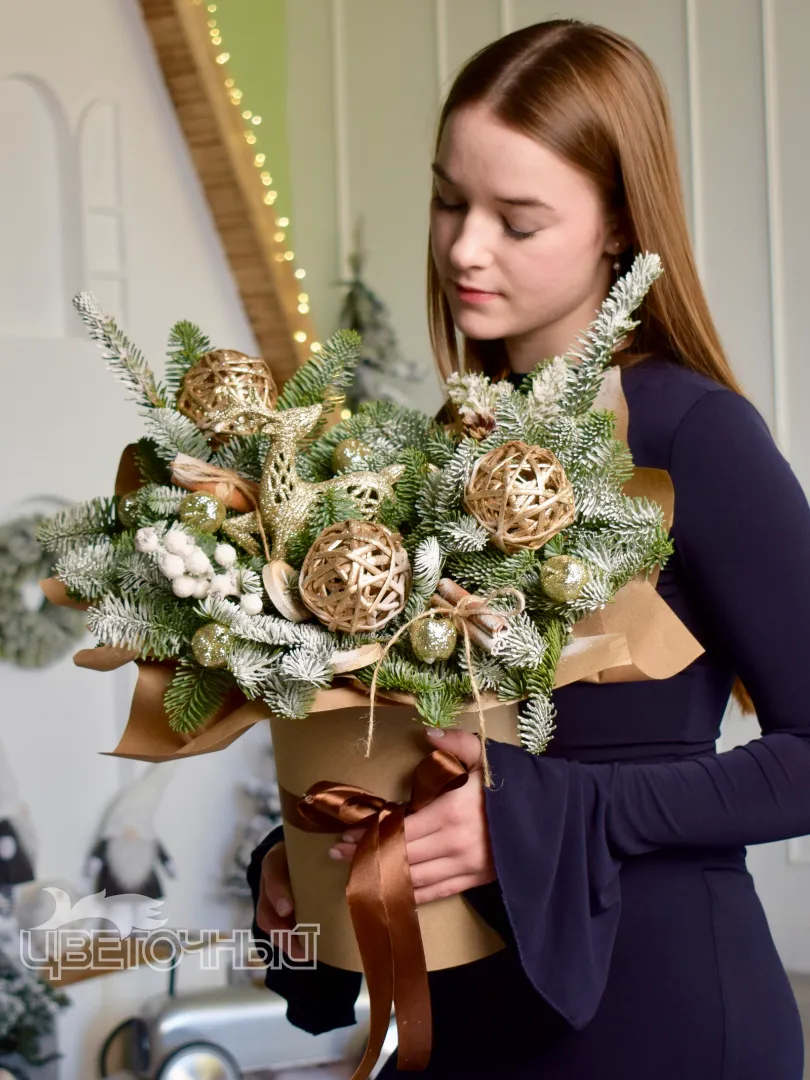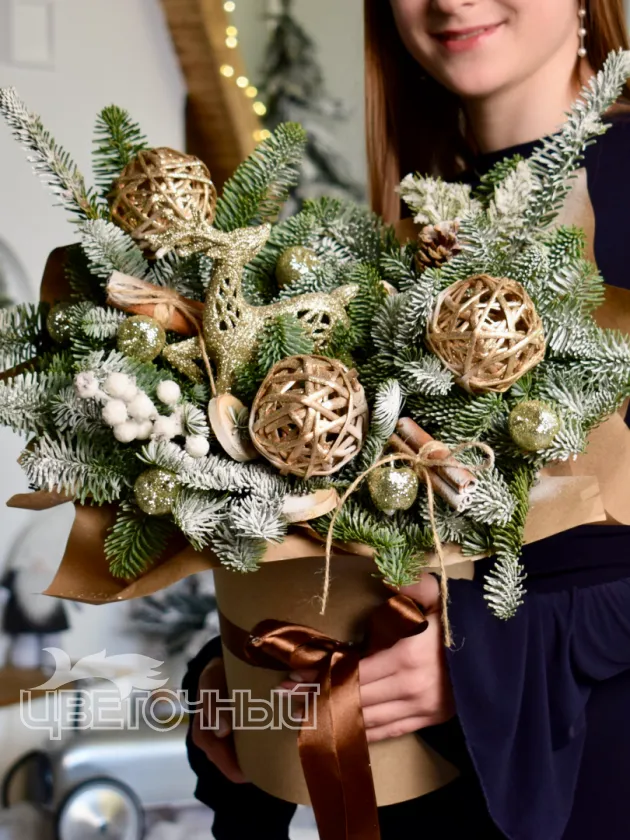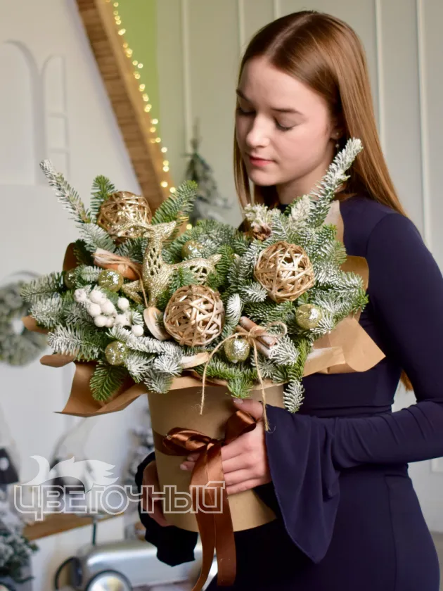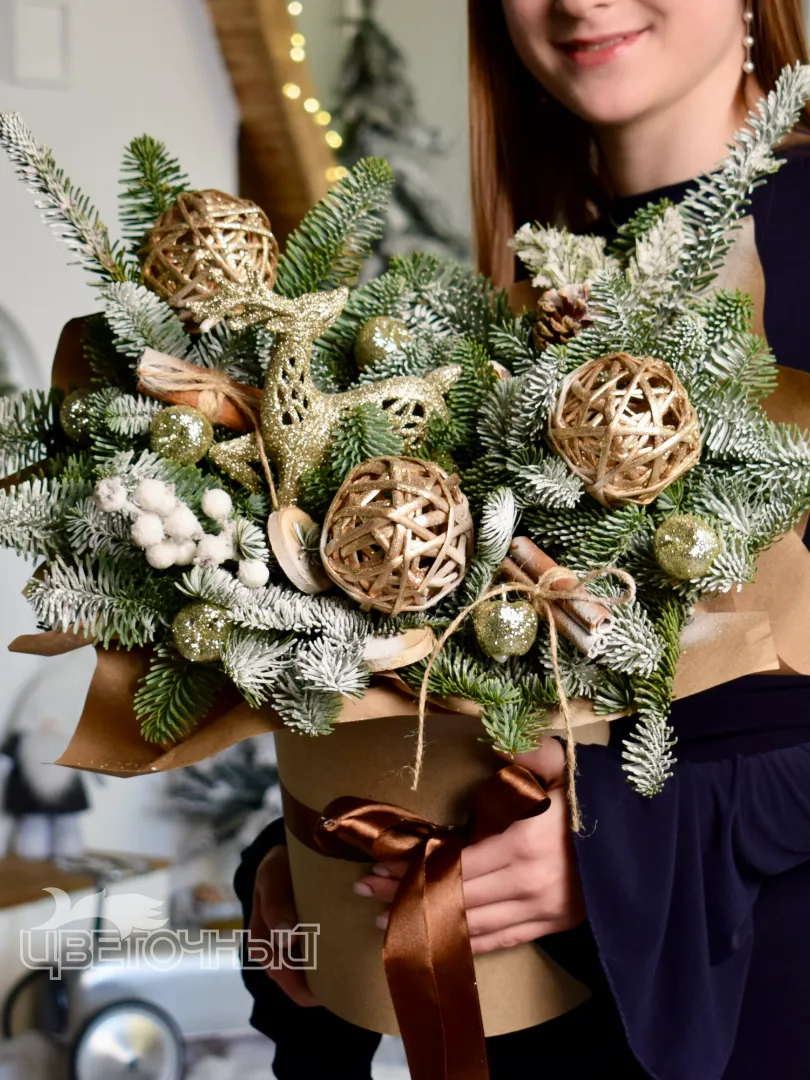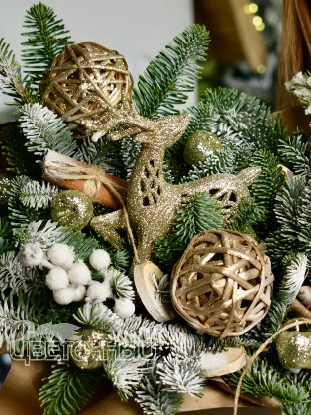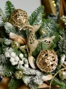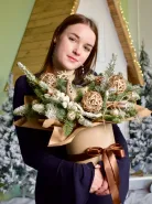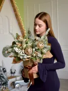 Описание букета: Зимний букет из веток ели и снежной сосны, украшенный золотистыми шарами и декоративными элементами из натуральной лозы. Такой букет идеально подойдёт для создания праздничной атмосферы в холодное время года и станет прекрасным дополнением к новогодним подаркам. Композиция выполнена в сдержанных зимних оттенках, что придаёт ей элегантность и подчёркивает природную красоту материалов.